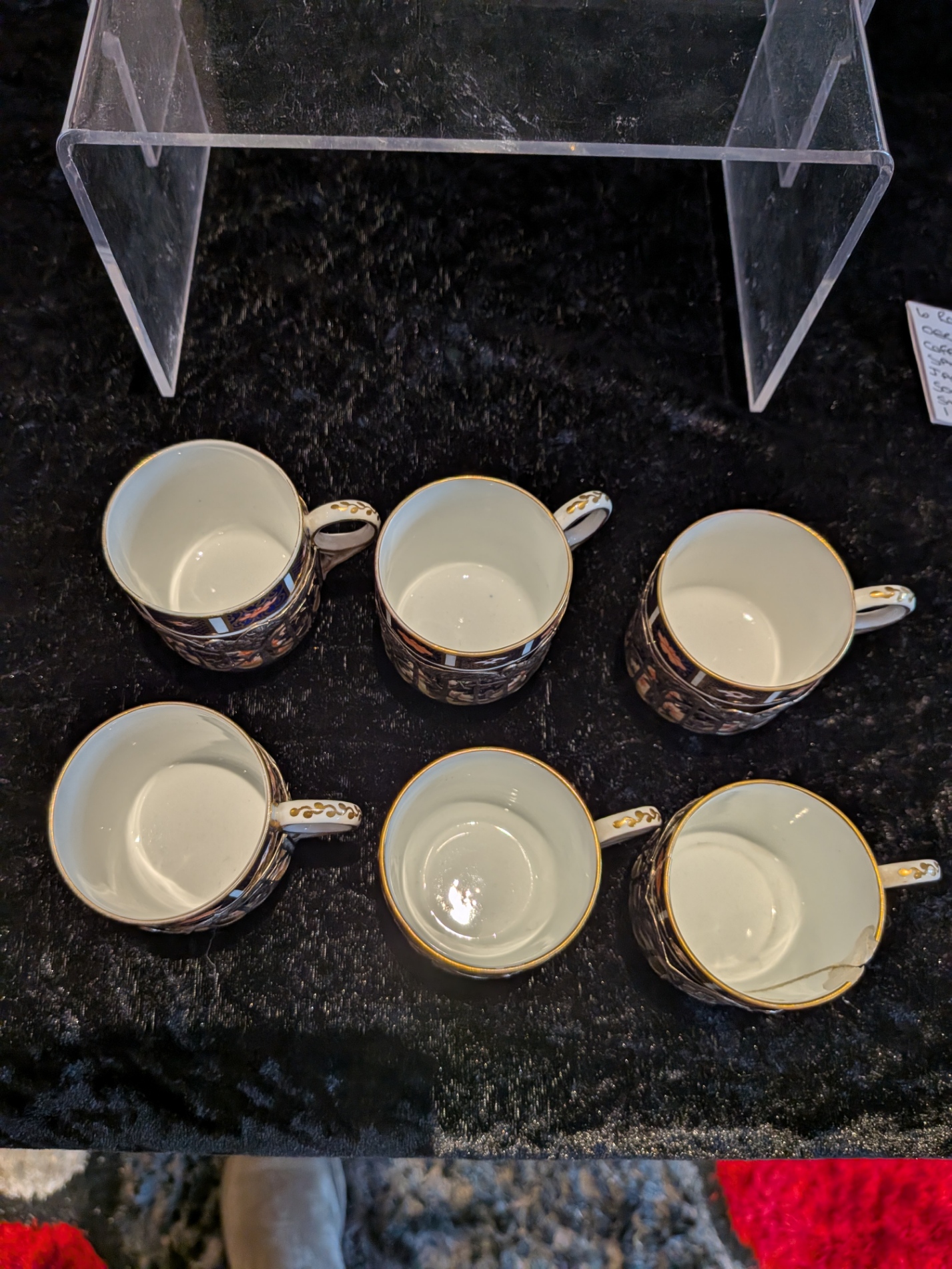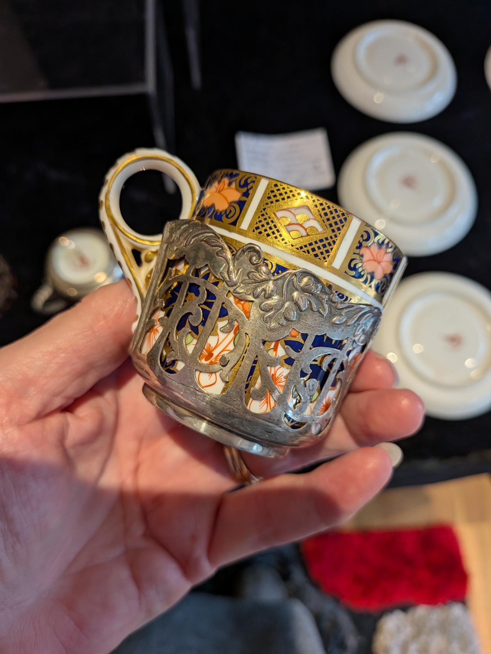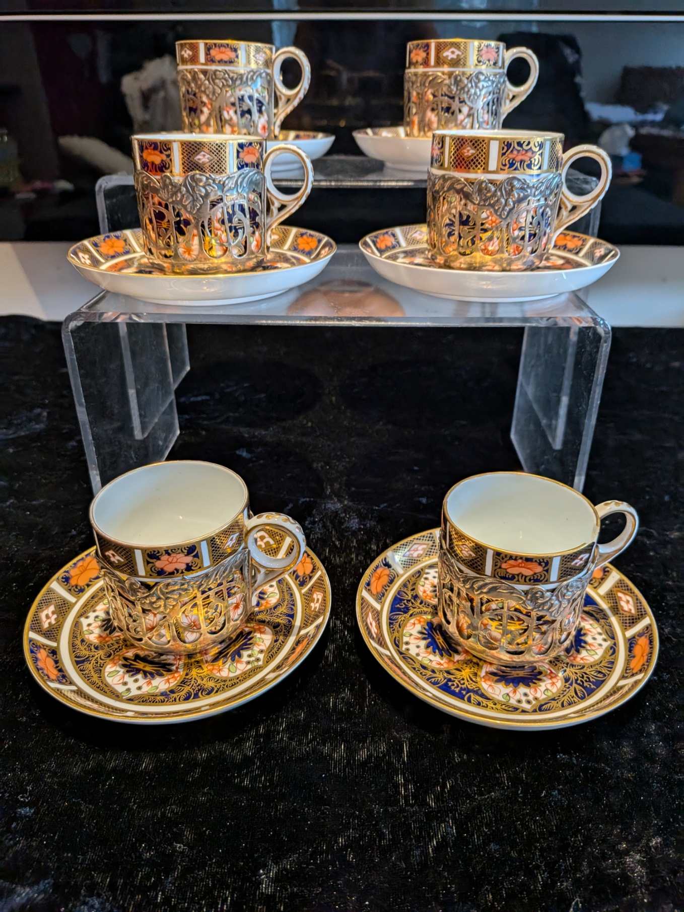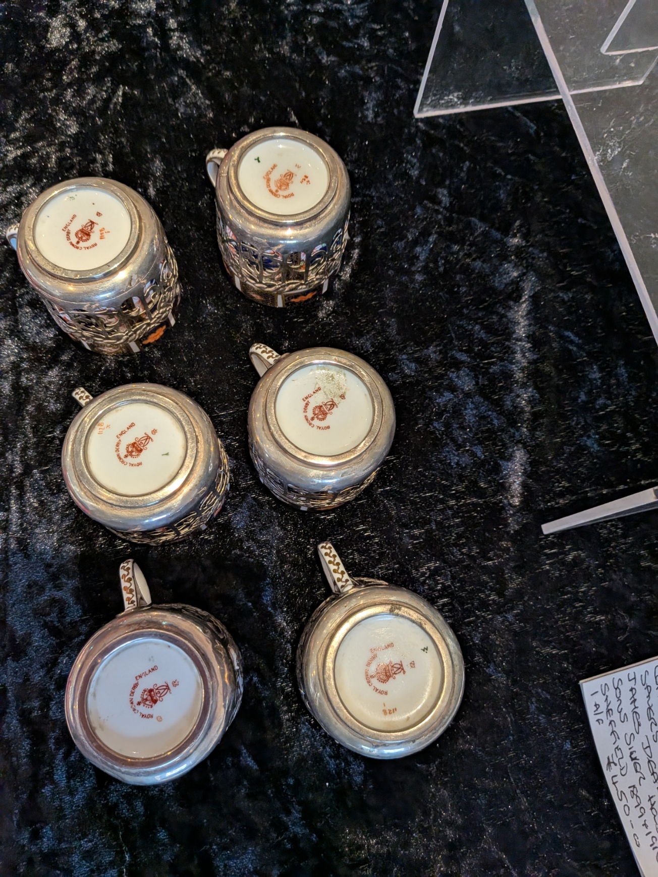 These are beautiful. Lovely little coffee cans in adorable silver holders, great gift. The holders are dated 1899 & 1910 and are by James Deakin & Sons of Sheffield. They are all in good condition with the exception of one cup which is chipped and cracked. This does not affect display as shown in the pictures.