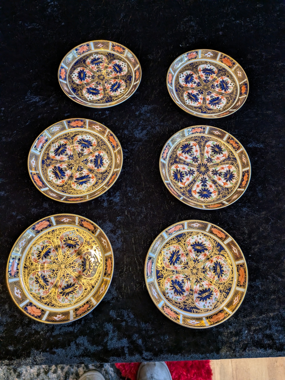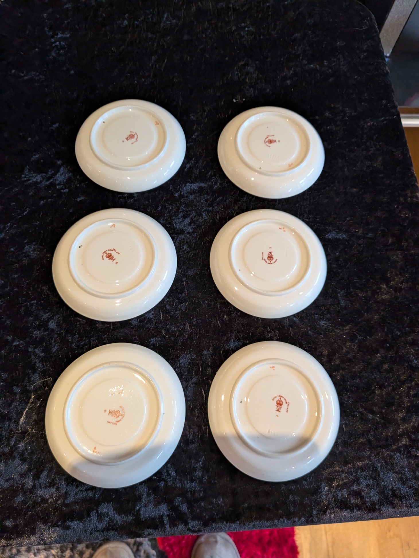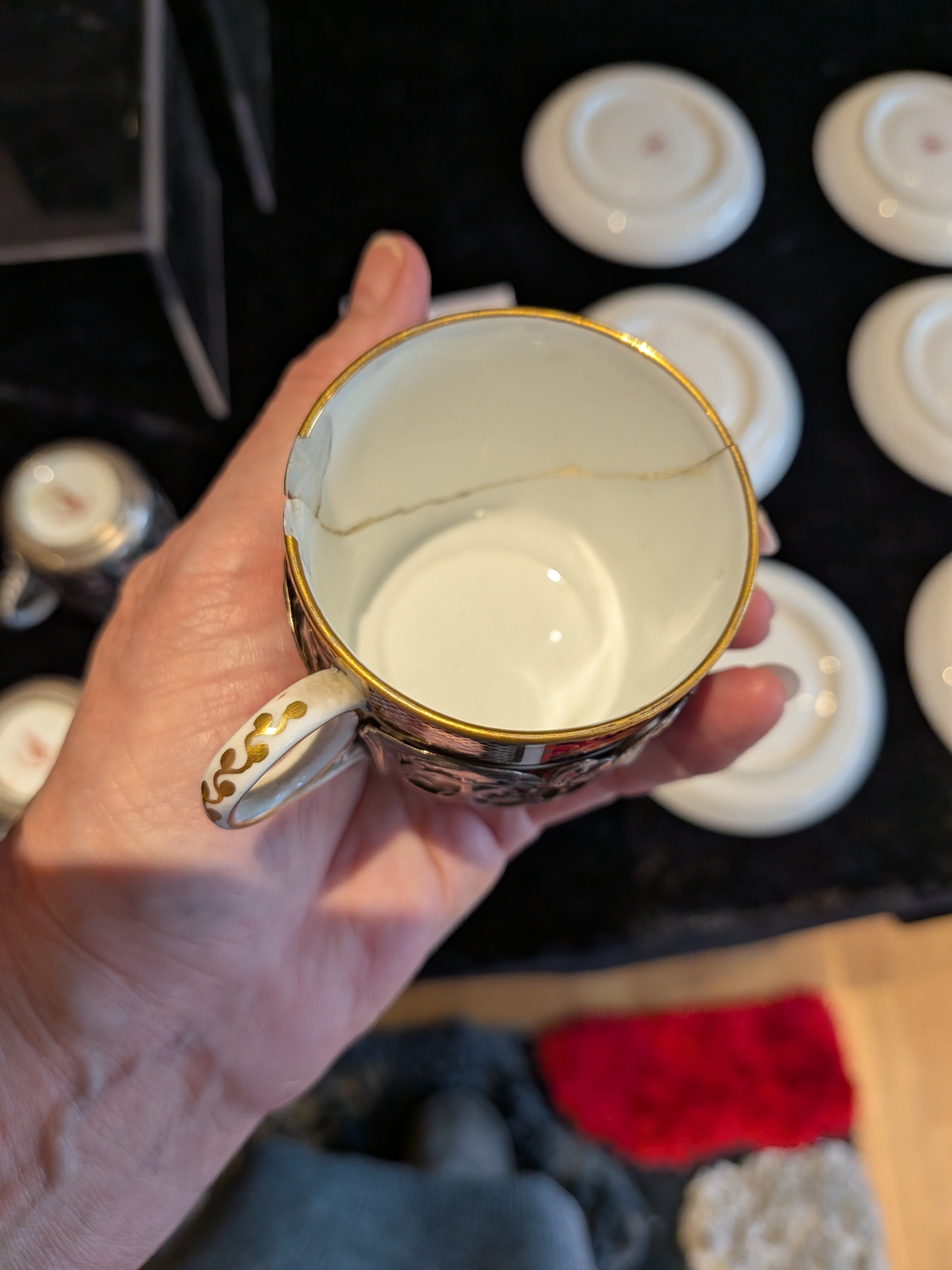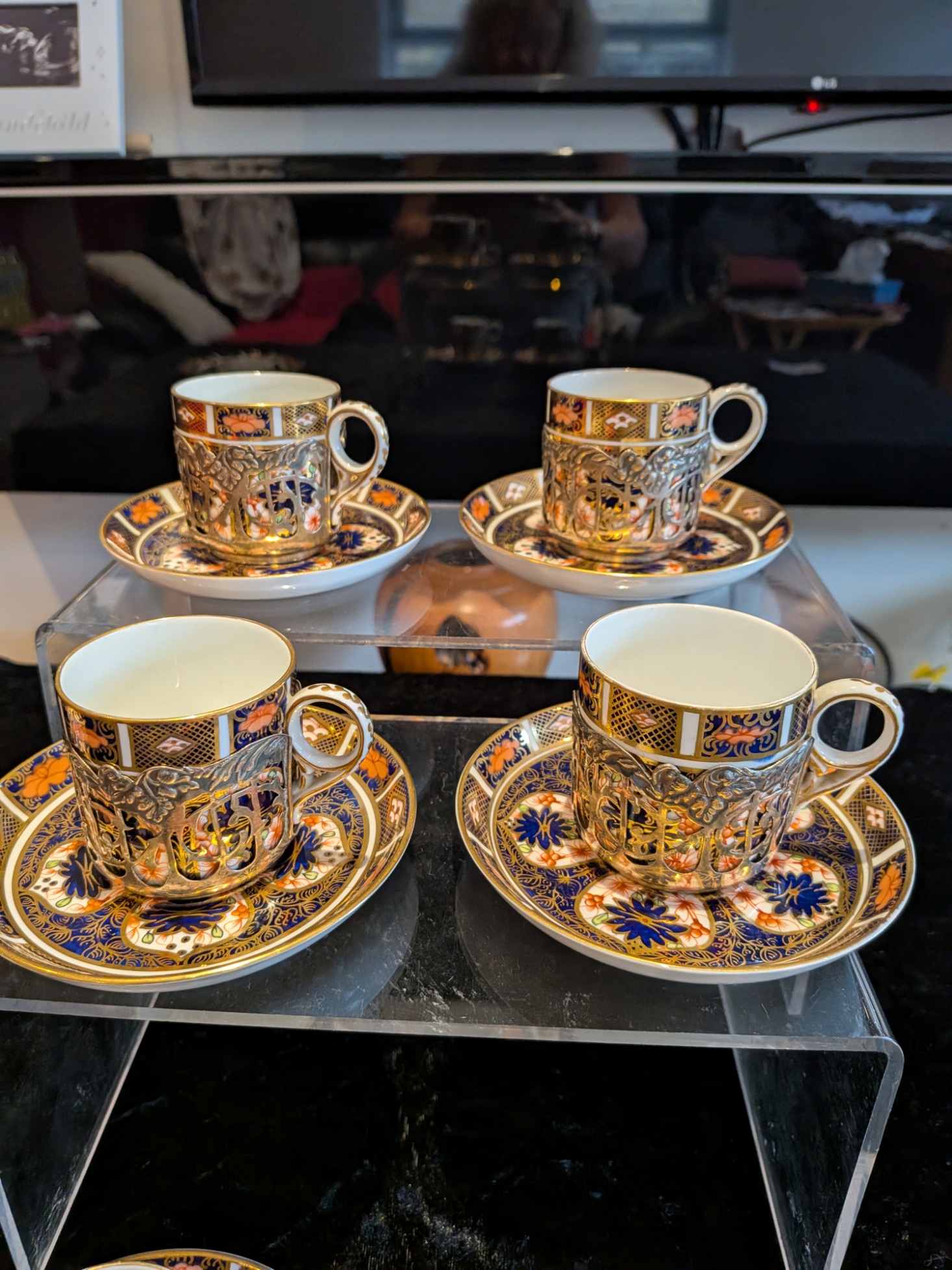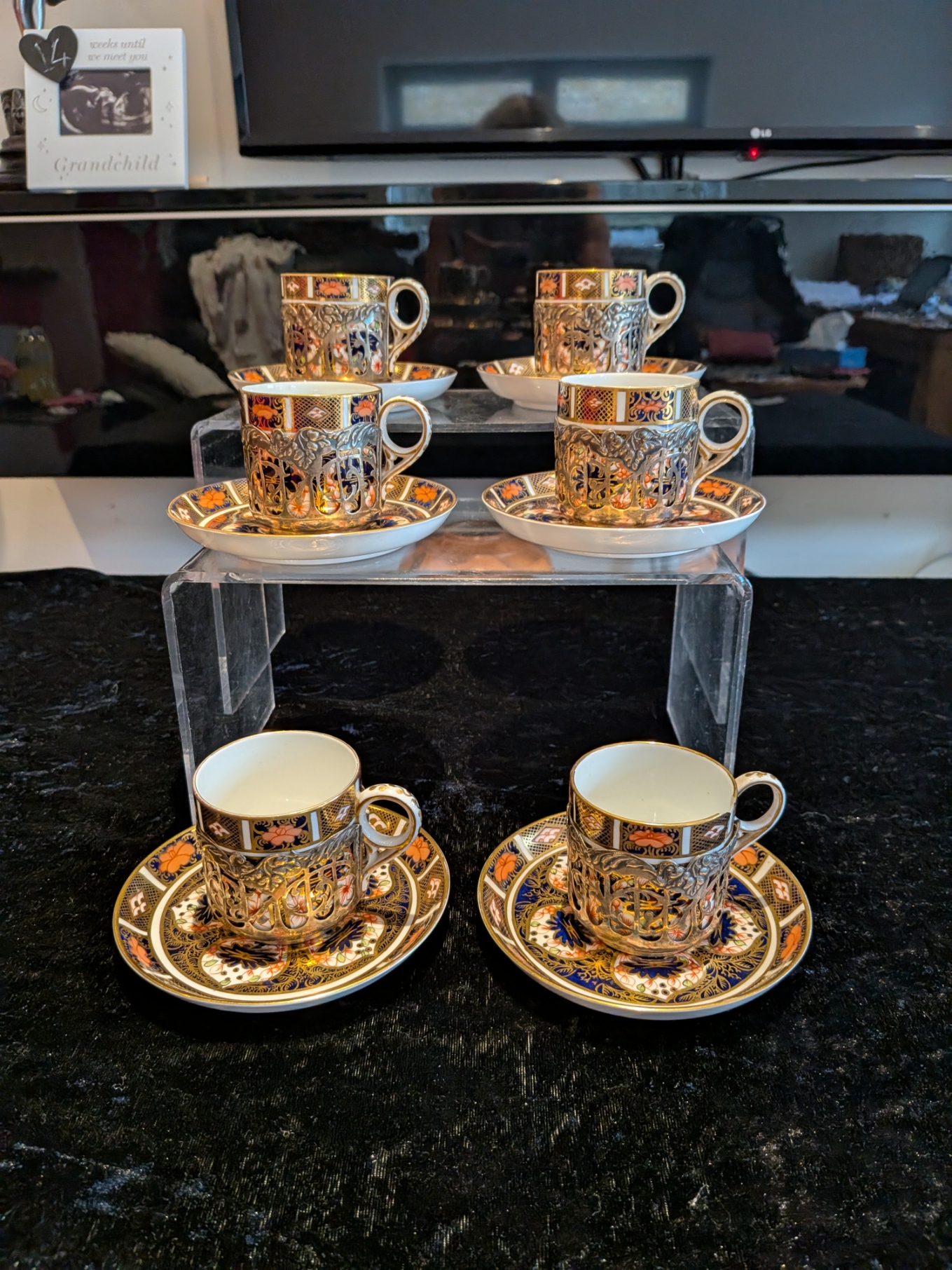 These are beautiful. Lovely little coffee cans in adorable silver holders, great gift. The holders are dated 1899 & 1910 and are by James Deakin & Sons of Sheffield. They are all in good condition with the exception of one cup which is chipped and cracked. This does not affect display as shown in the pictures.